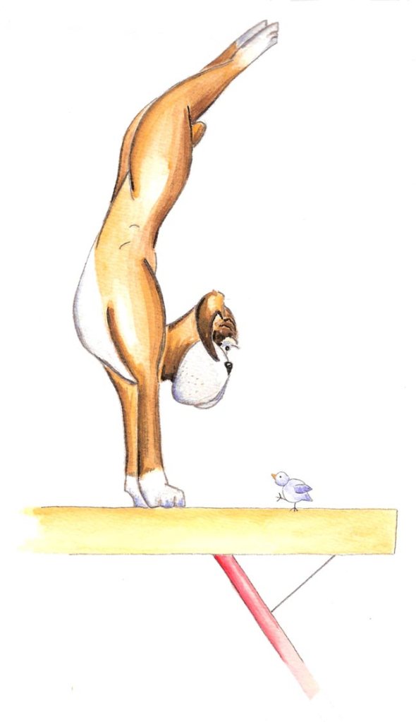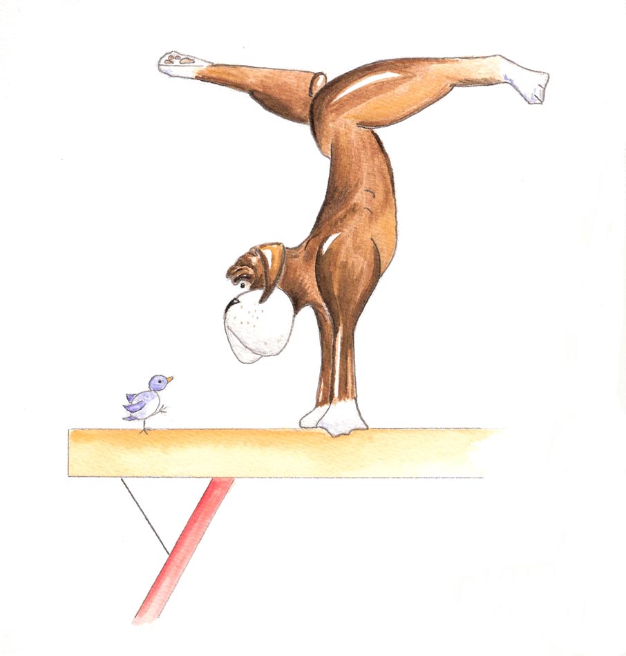 Benson the Boxer demonstrates his beam work to his little bird friend!