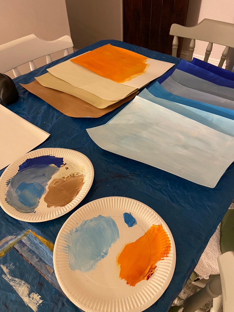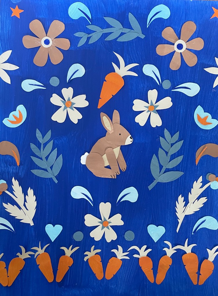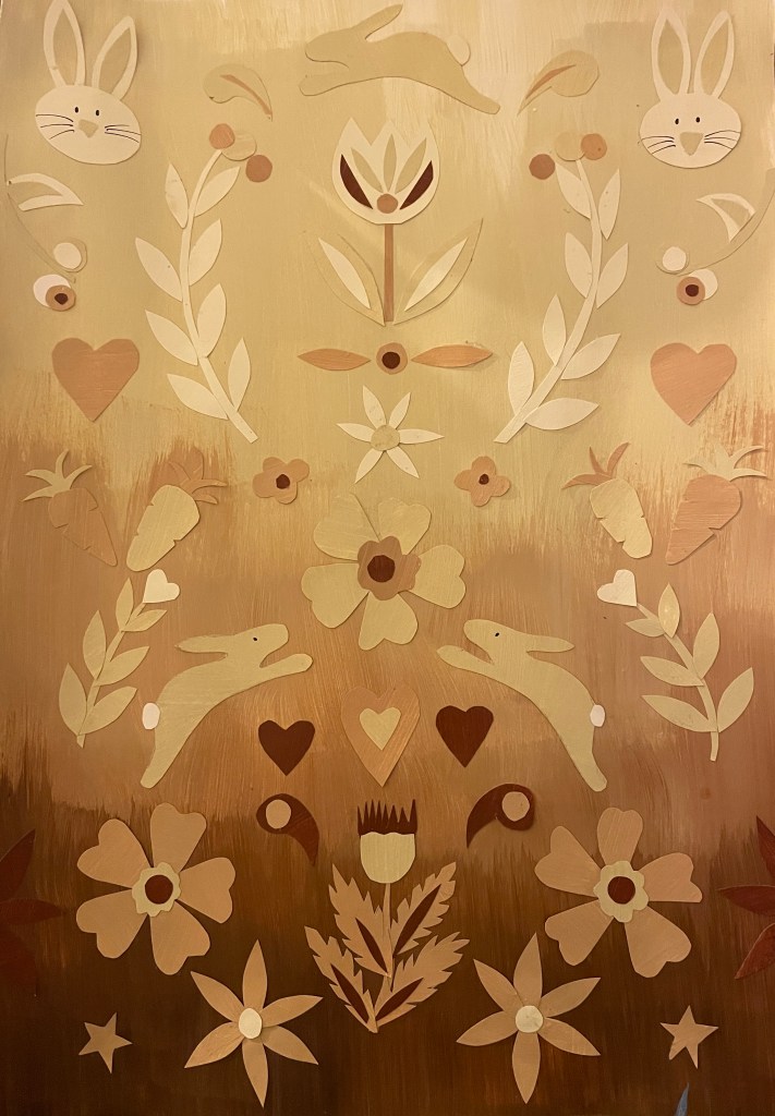 This was an experiment to design some folk art for a project based on Peter Rabbit. I usually use found papers but for this project I created my own colours using acrylic paints.